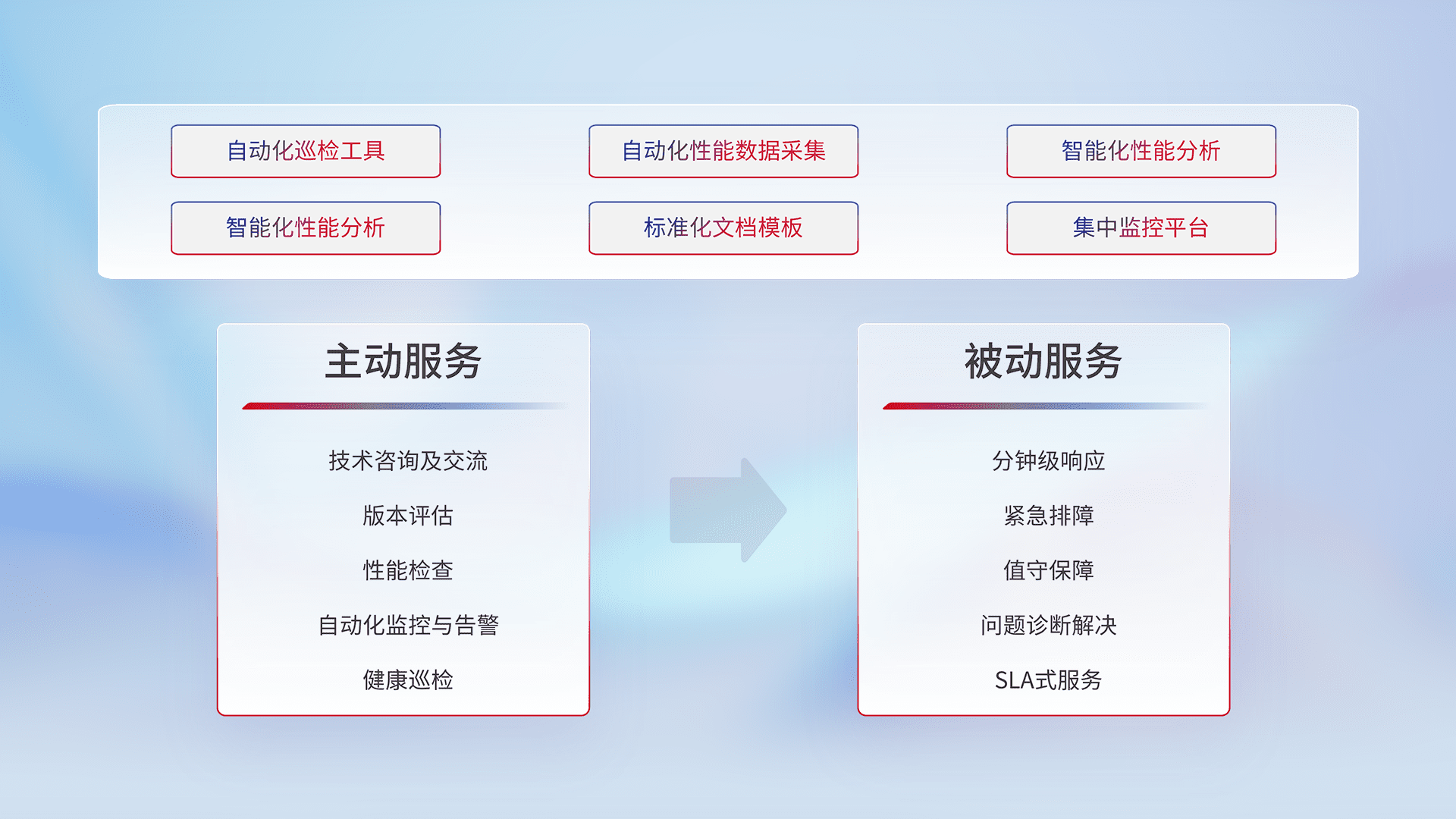 智能化工具和标准化文档,,,,保障服务质量,,提供主动服务(包含技术咨询、、、版本评估、、性能检查、、自动化监控与告警、、、、健康巡检)和被动服务包含(分钟级响应、、紧急排障、、、值守保障、、问题诊断解决、、SLA服务)。。。。