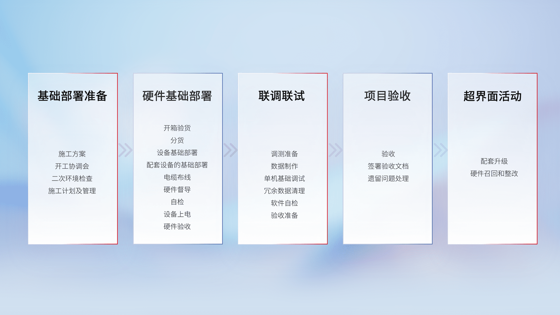 从基础部署准备、、、、硬件基础部署、、、联调联试、、、项目验收、、越界面活动的全过程可追溯,,,,保证施工质量和进度。。
